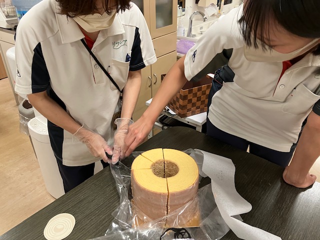 あまりの大きさに職員も緊張した様子でバームクーヘンをカットしました。
