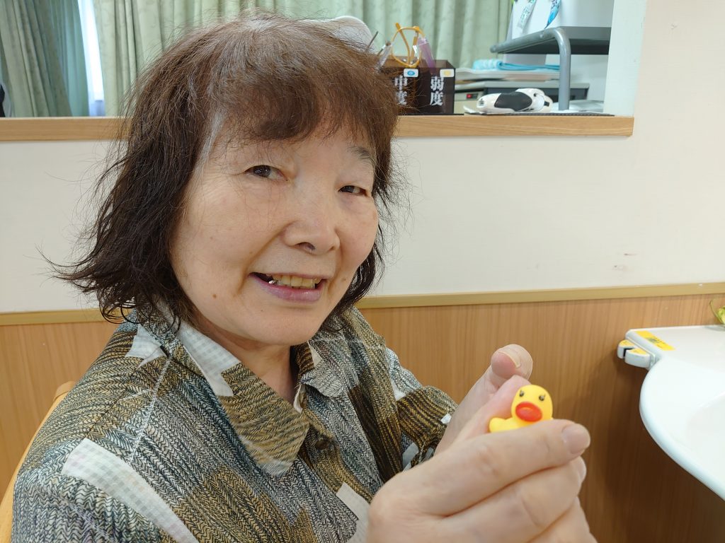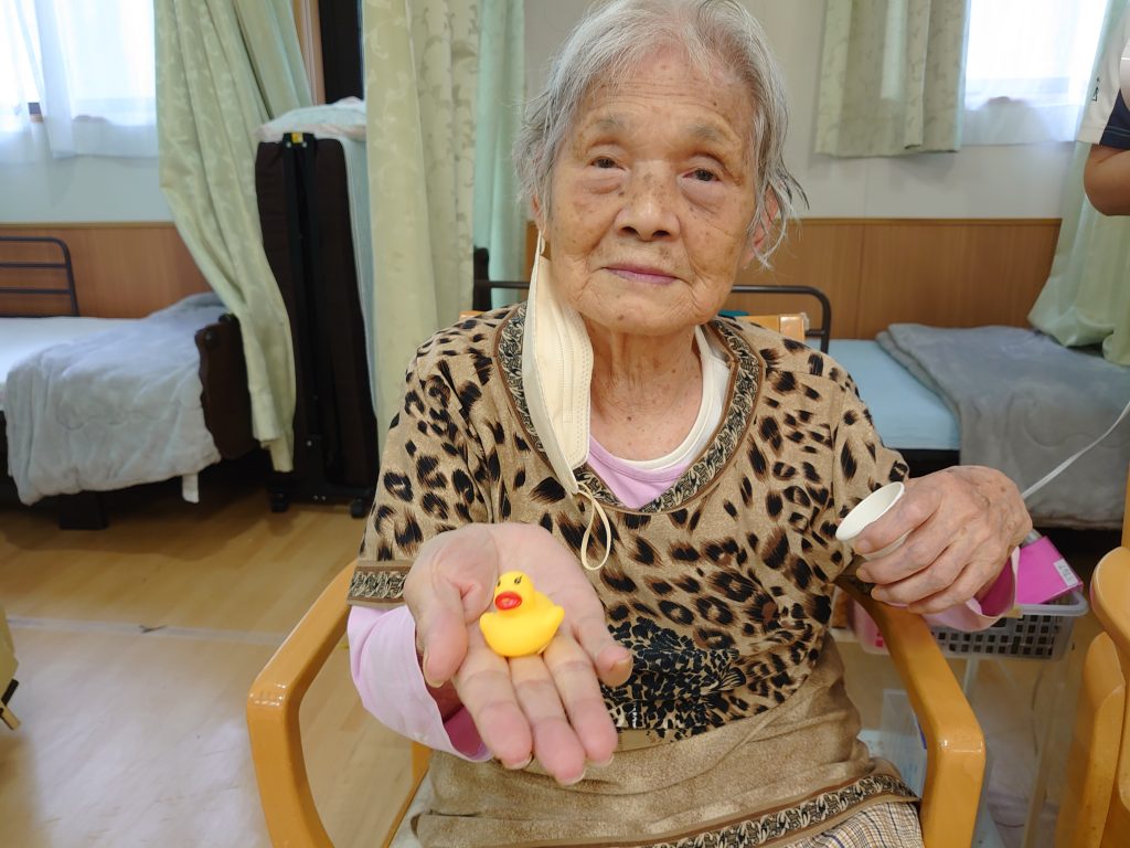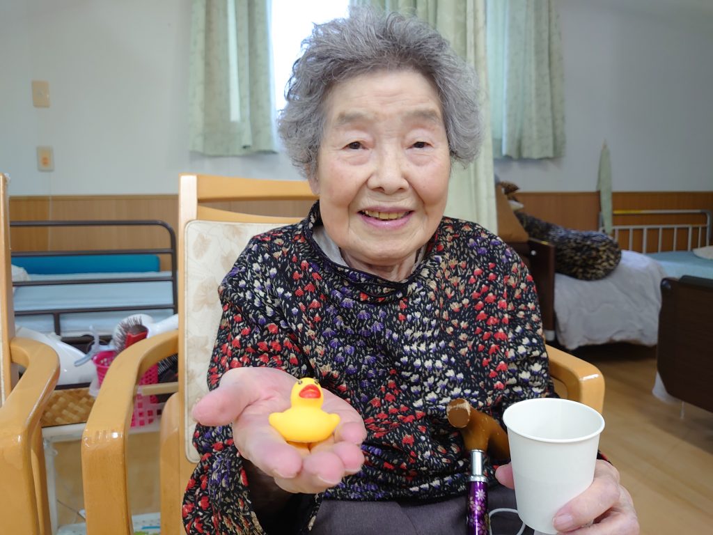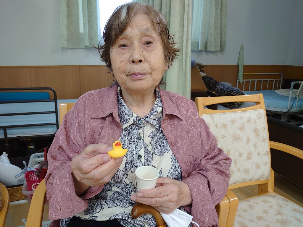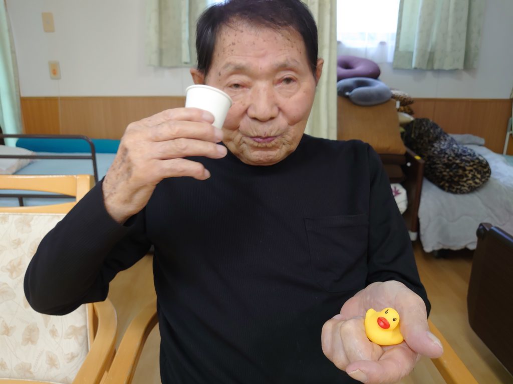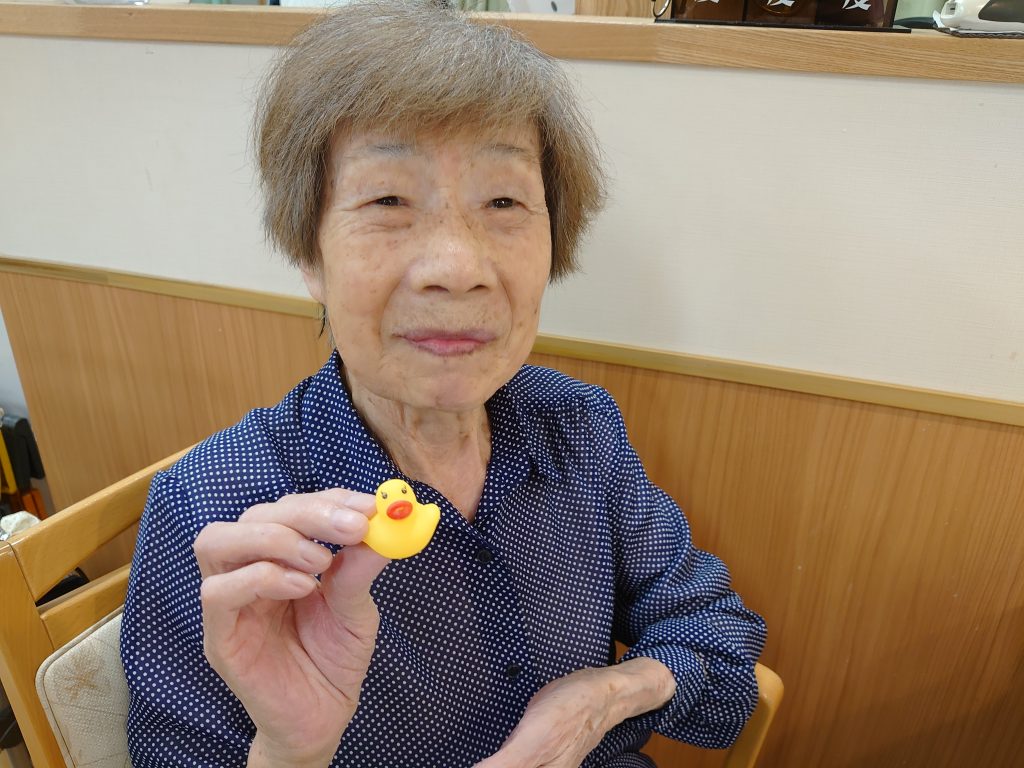 「昔は銭湯でよく飲んだなー」と思い出話に花が咲き、小さなアヒルを手にして「孫が喜びそう」とうれしそうに笑う姿も。