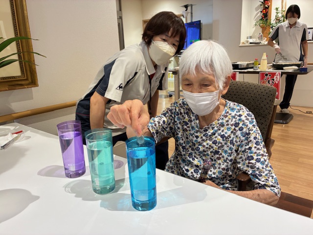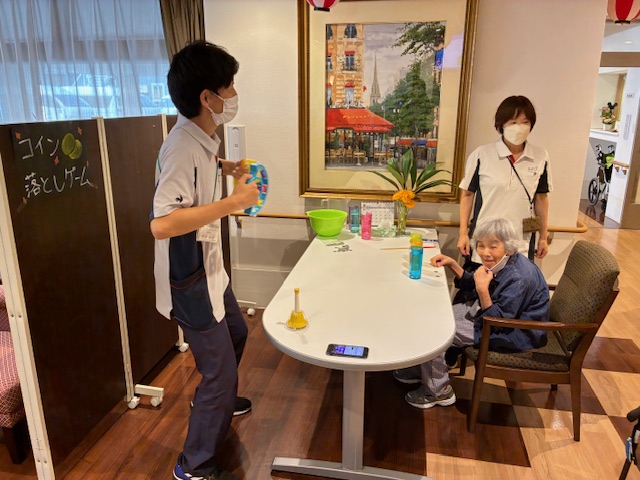 水の入ったコップの中にコインを落とすゲームをやりました。