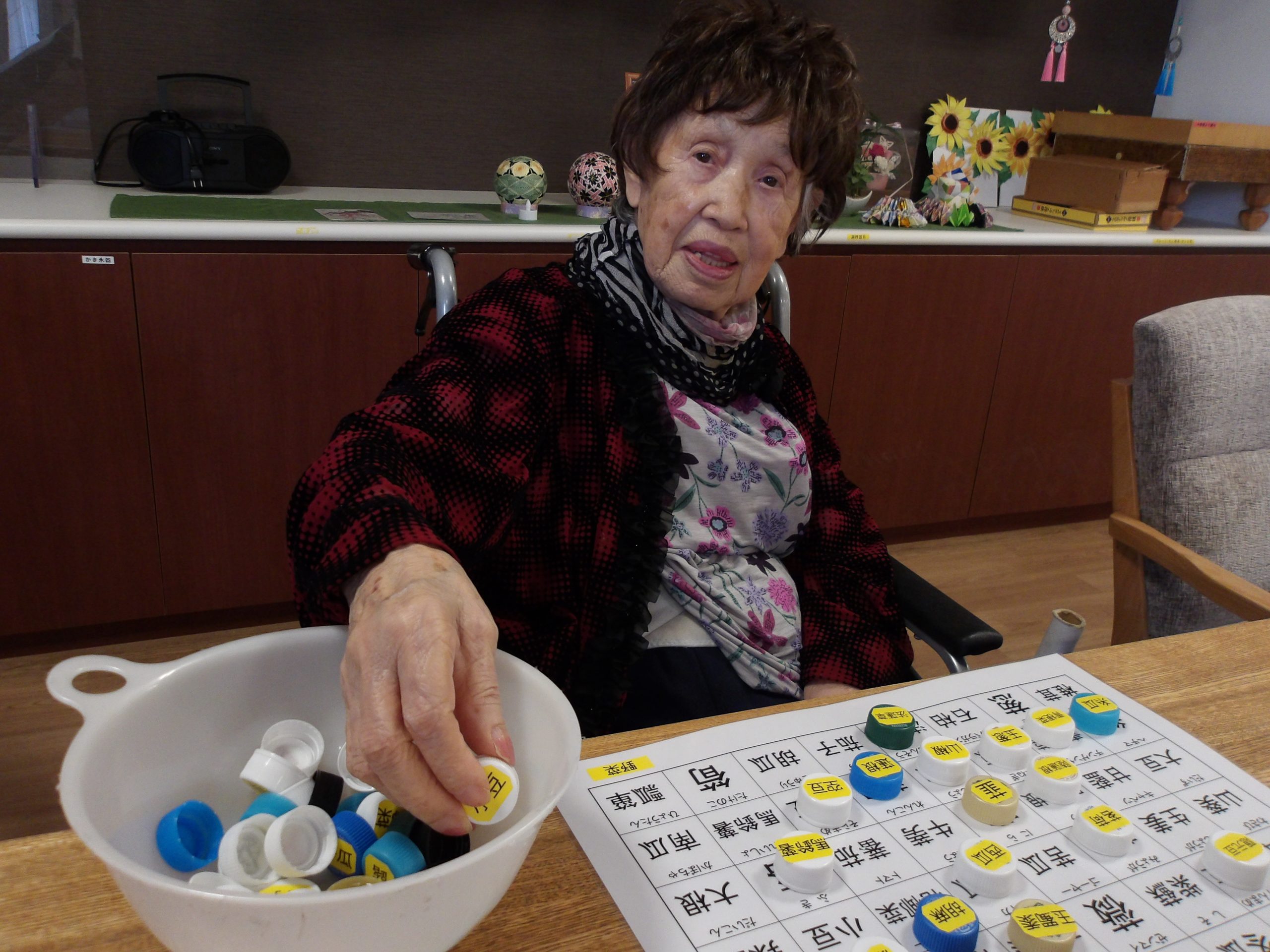 ペットボトルのキャップに書かれた漢字と、台紙に書かれた漢字を組み合わせる脳トレを行いました👀