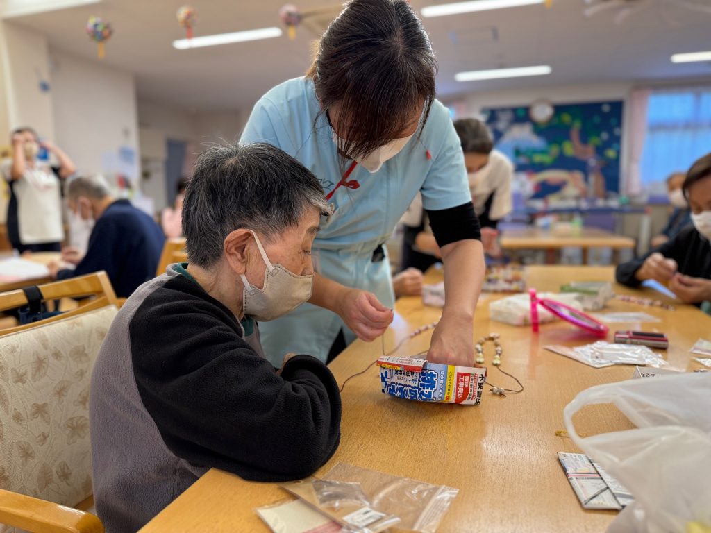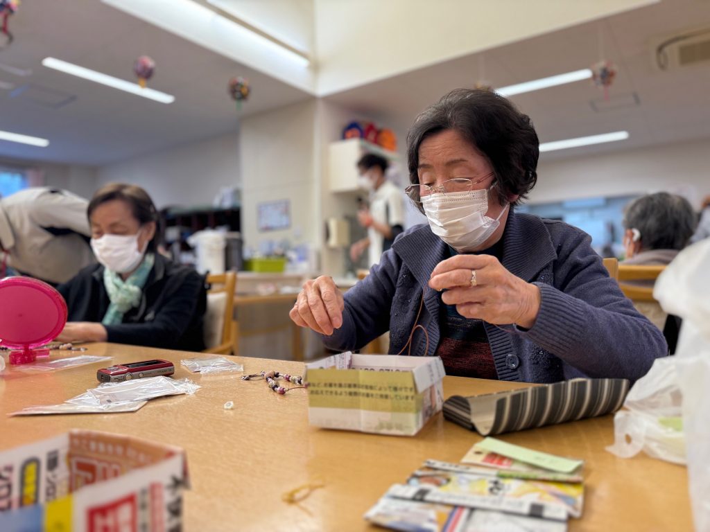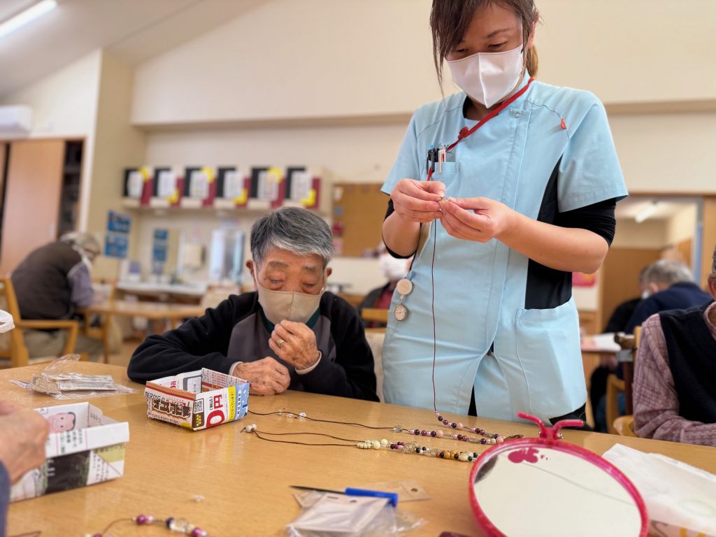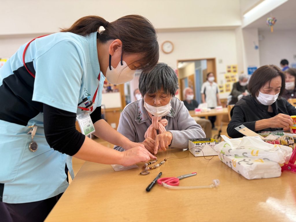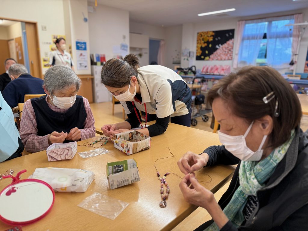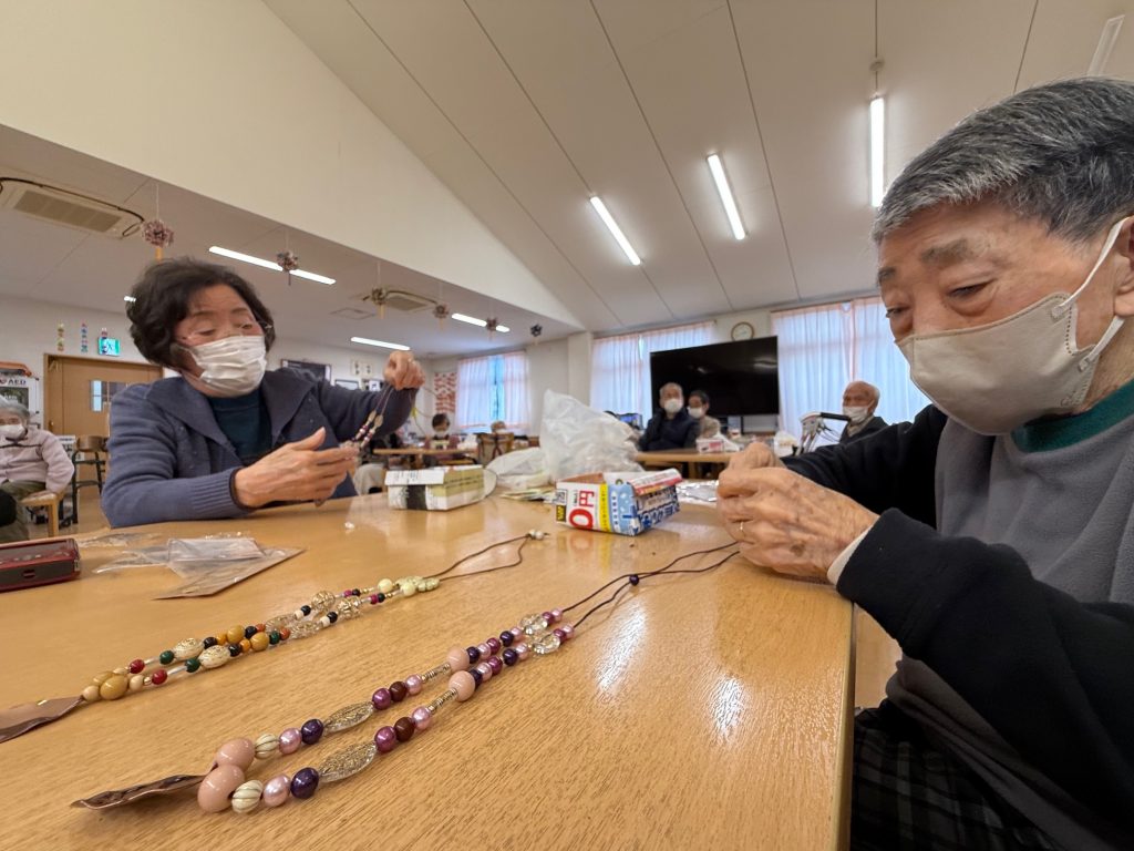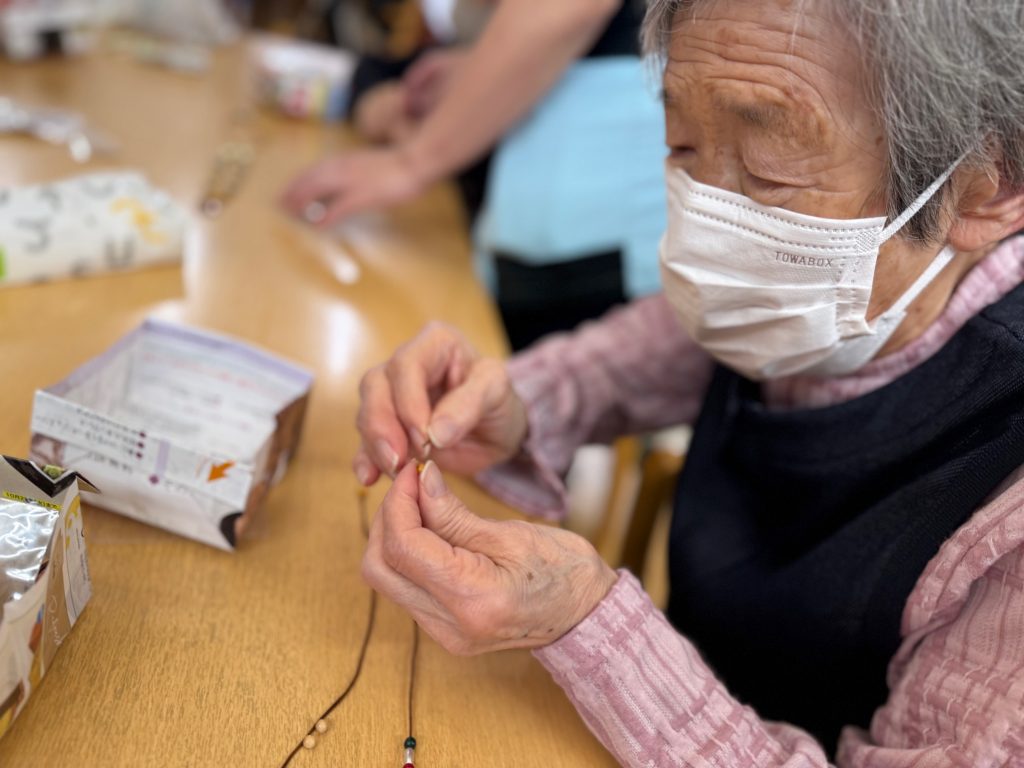 小さな部品に紐を通していく作業がとても難しそうでした