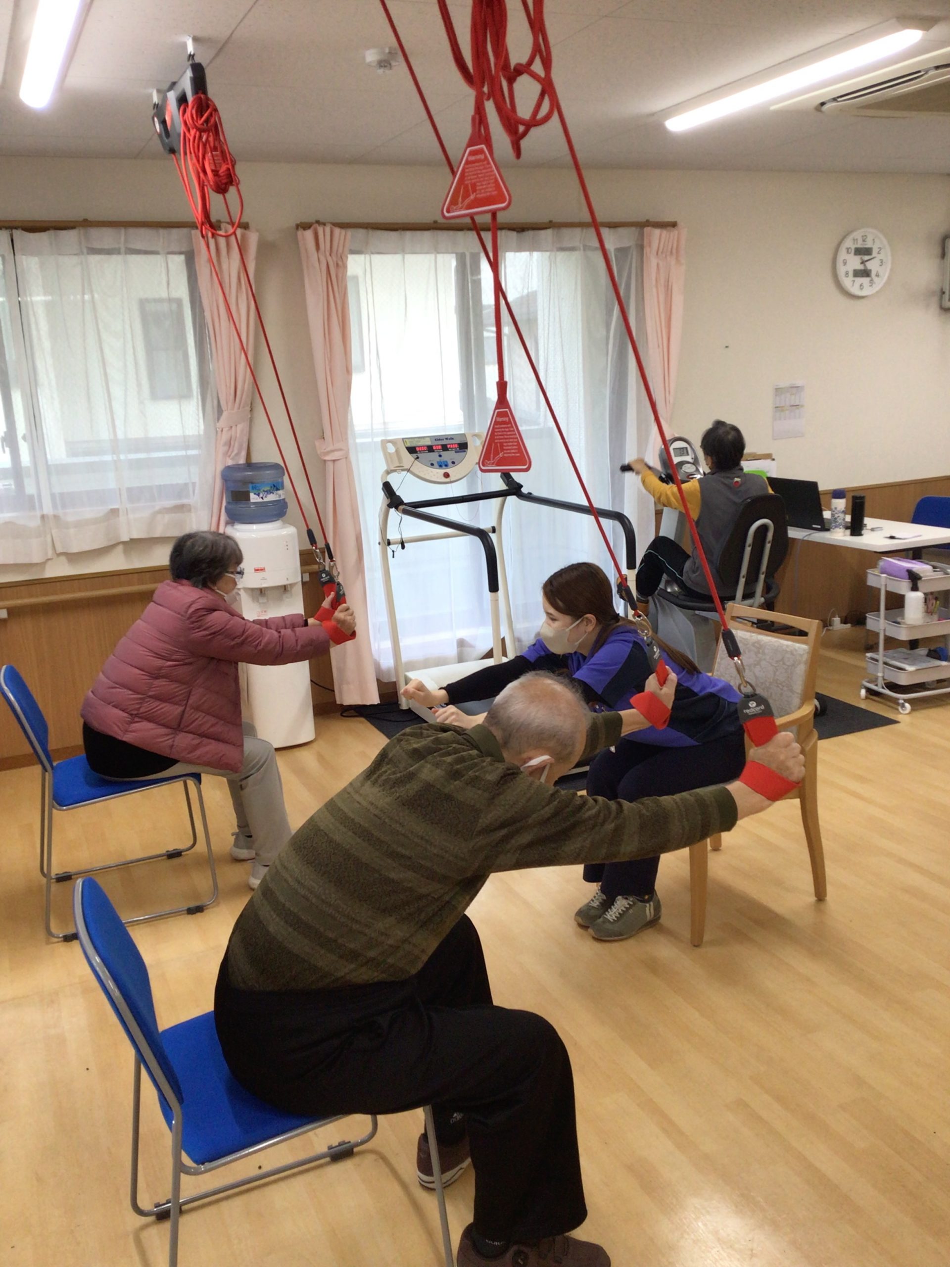 レッドコードとは、天井から下げられた赤いロープを使って行う運動療法で、体への負担の割には通常の運動より負担や苦しさを感じることが少なく、効率的に楽しく効果を上げていくことができると言われています。
