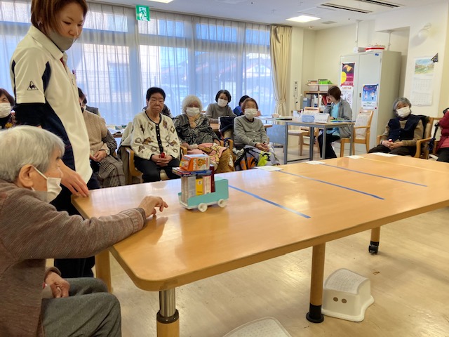たくさんの荷物を積んで遠くまで運んでもらうゲームを行いました。