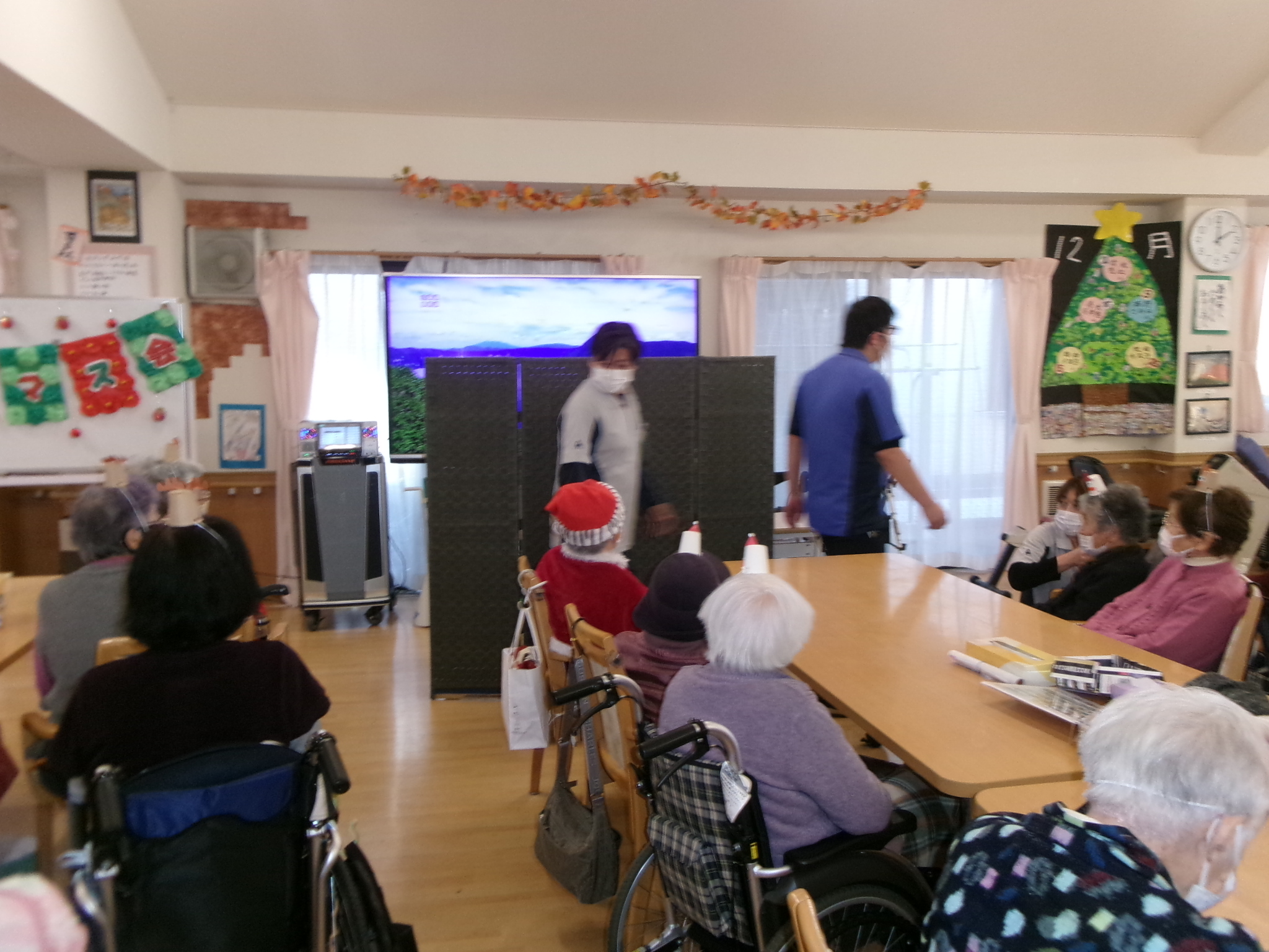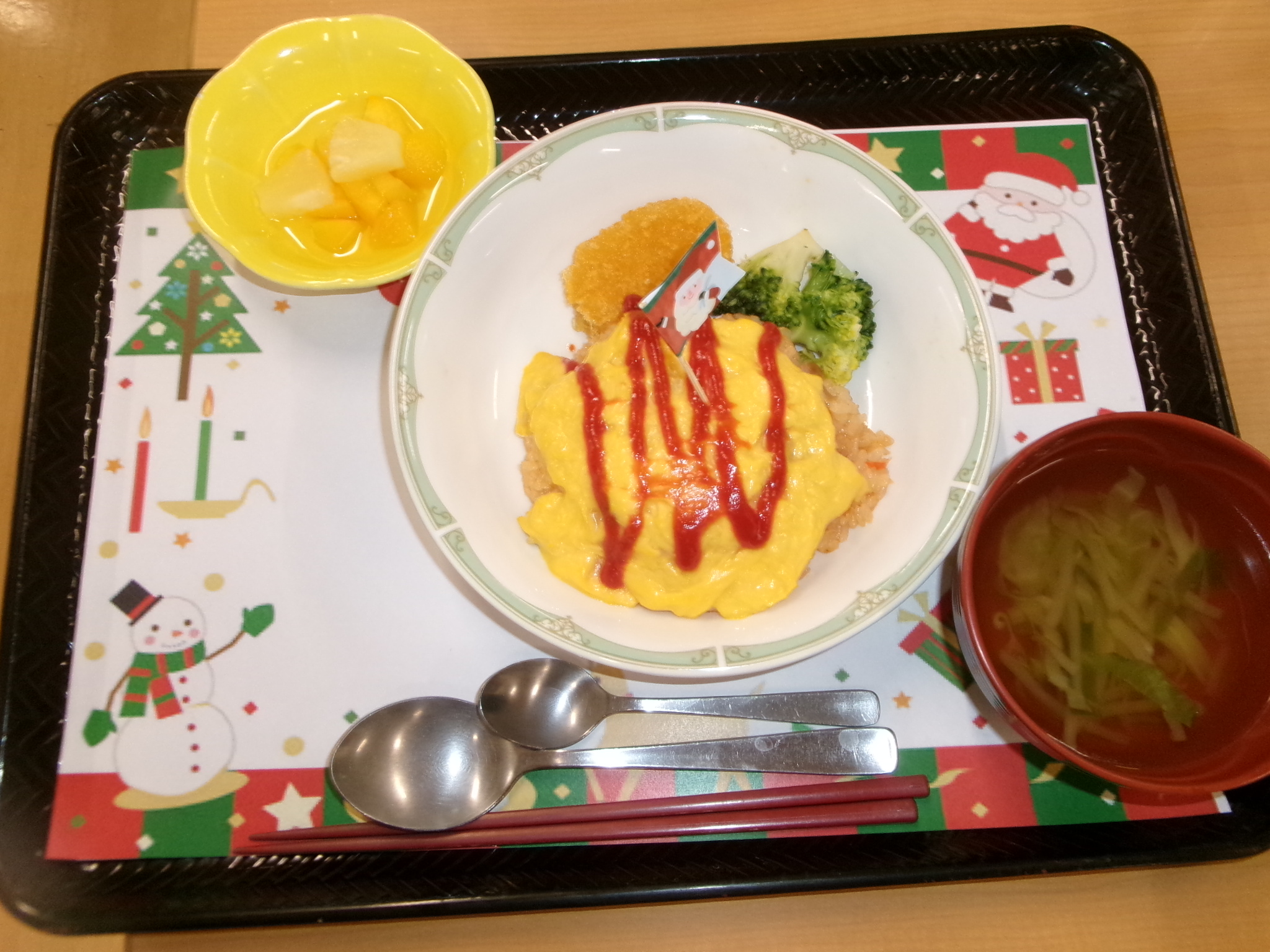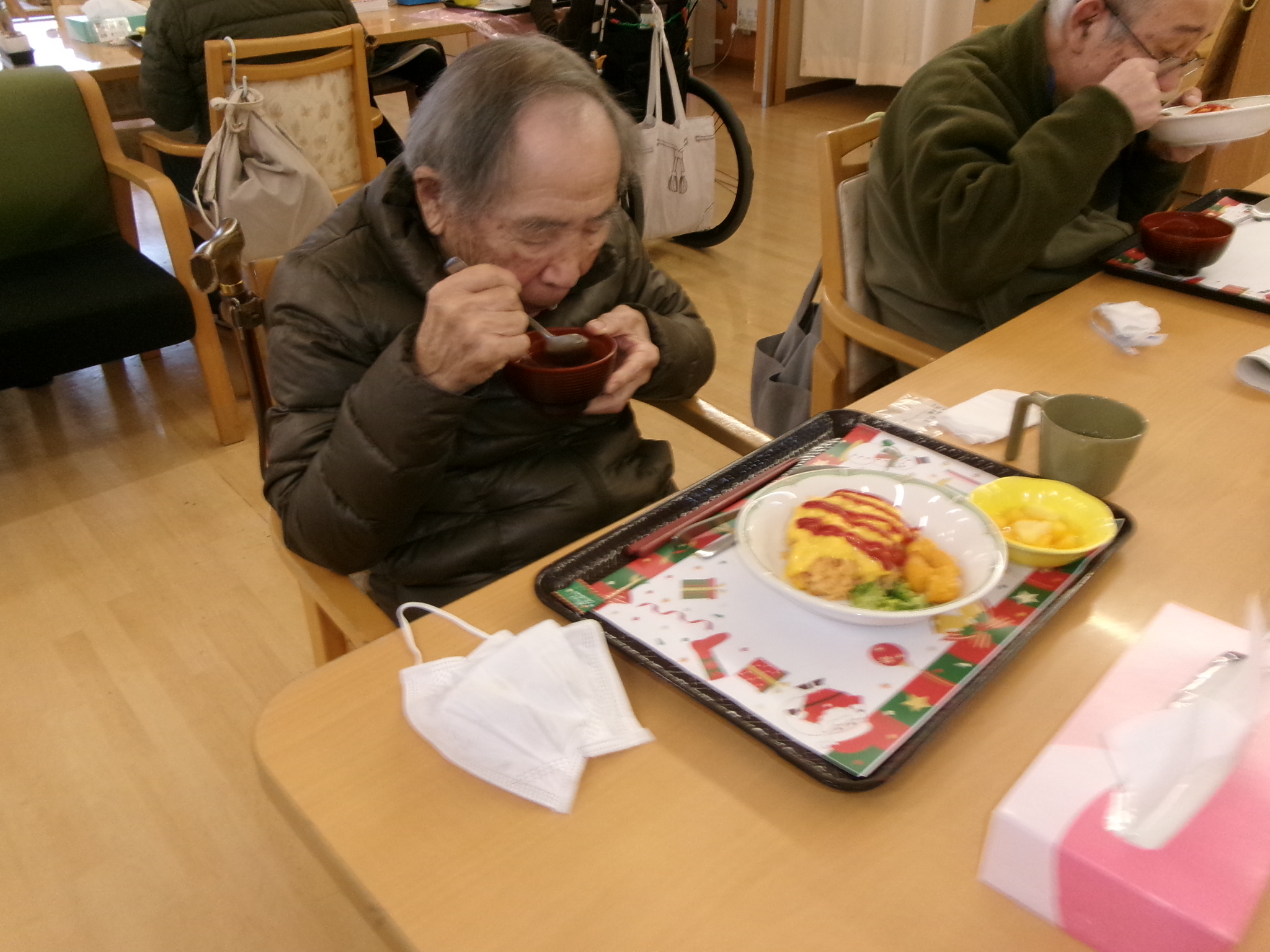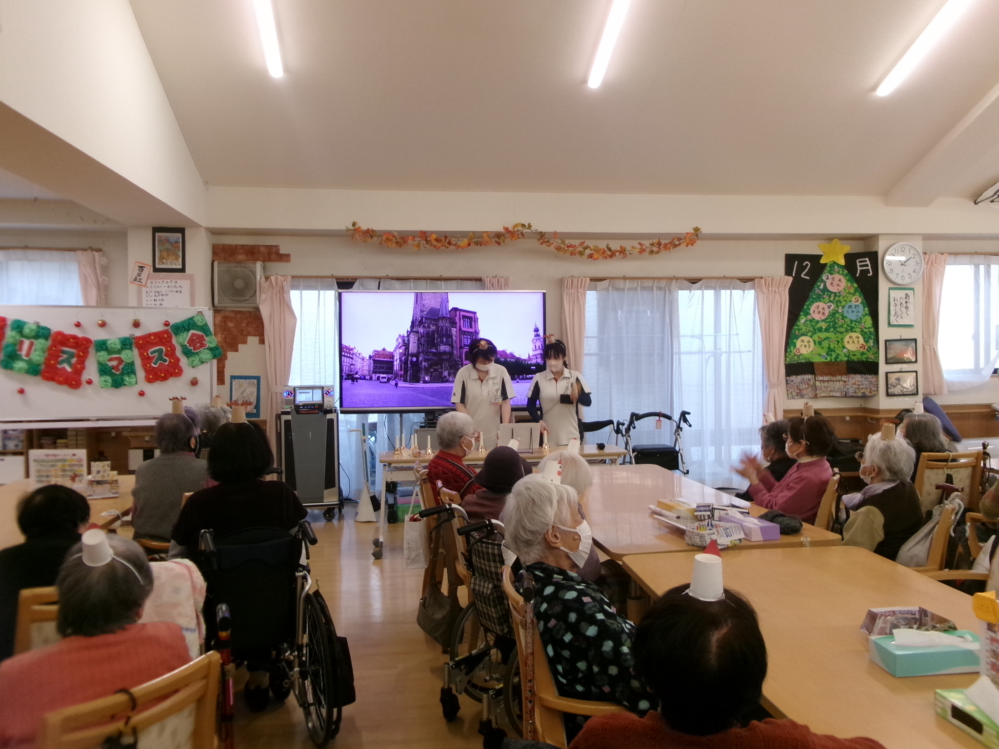 2025.12.12 🌳クリスマス会🌳 待ちに待ったクリスマス会🥰 お昼には特別メニューのオムライスを提供しました😝 とても美味しくお腹がいっぱいになりました😝 昼食を終えると職員によるハンドベルの演奏が始まりました。職員も緊張気味😂 みんなが知っている曲なので口ずさんでくれました😊 次は間違い探し🤩 違いが分かるかな😂 あまり変わってないような😏 正解は私にも分かりません😂 おやつには箱に入ったカップケーキを用意しました💕 可愛いケーキを食べてみんなとても笑顔🤗 最後はビンゴゲーム!!! 景品をかけみんな真剣💦 景品をもらいとても喜んでくれました🤗 一覧へ戻る