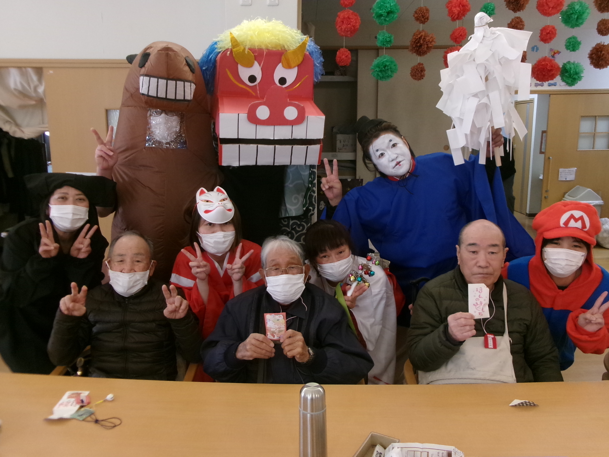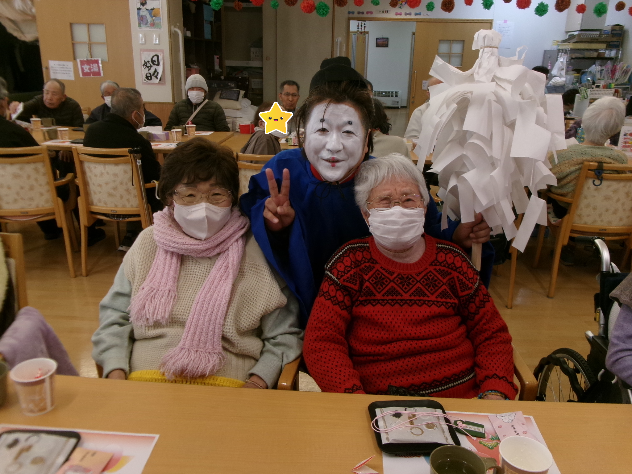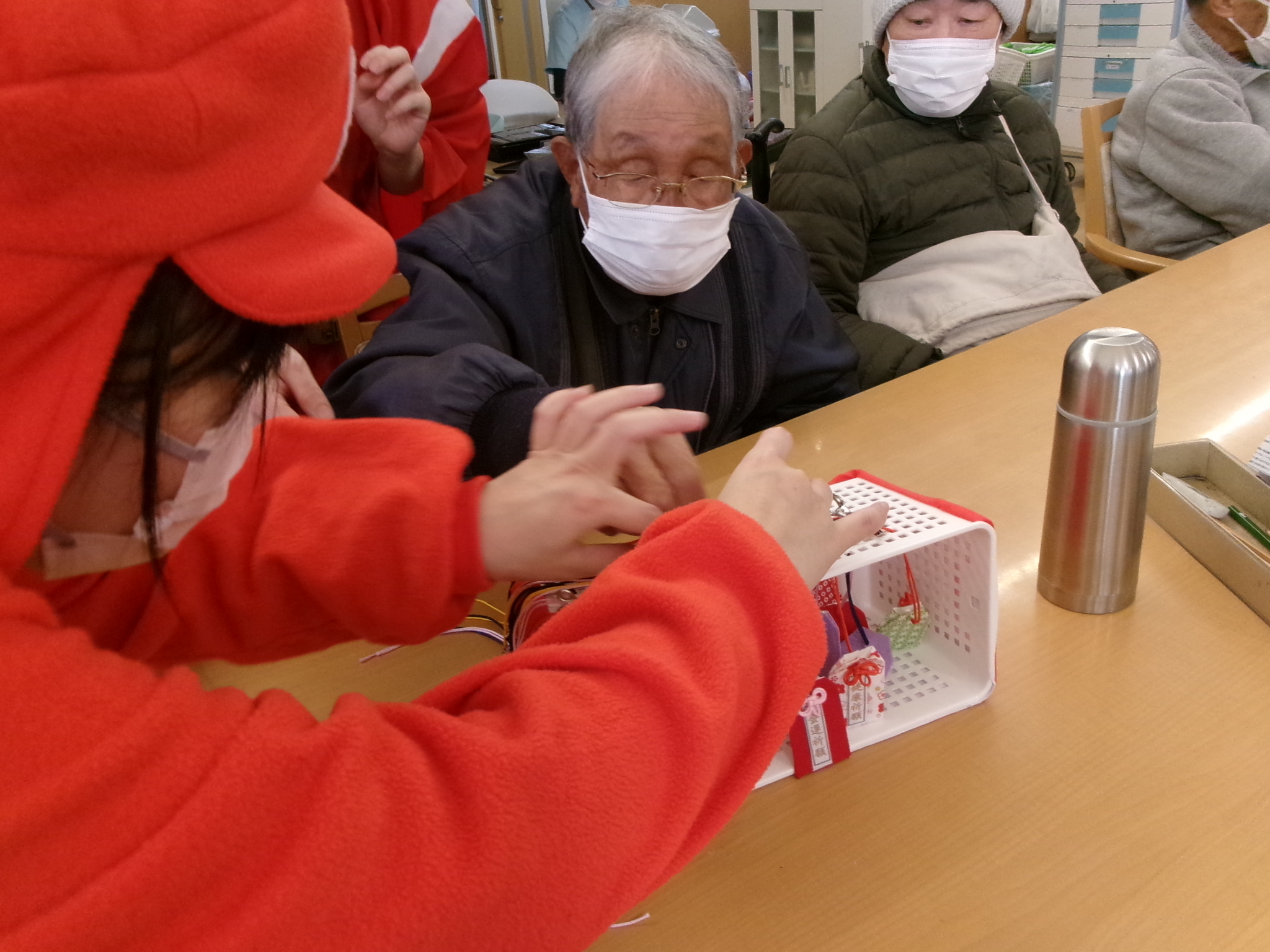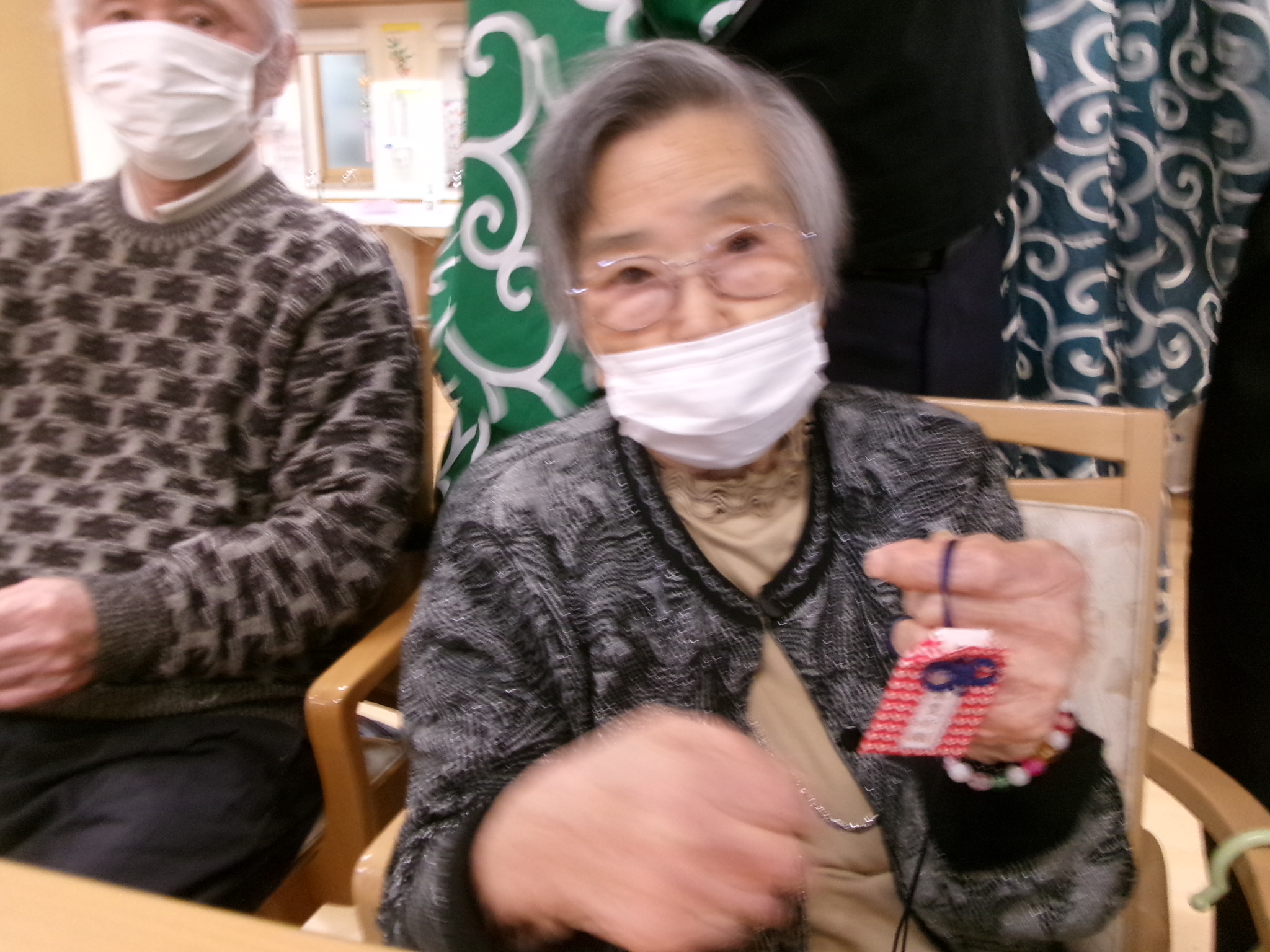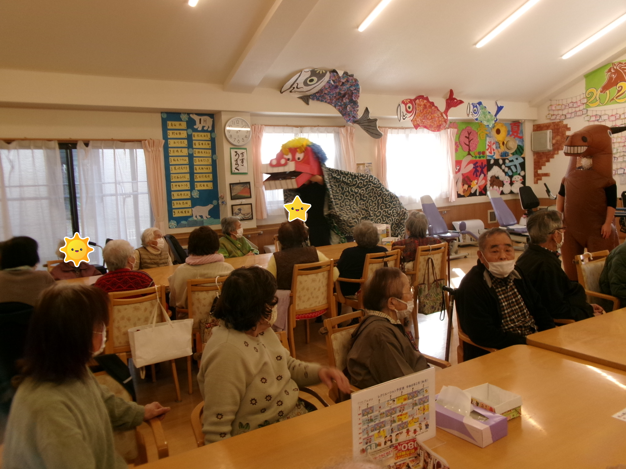 獅子舞の登場。手作り獅子舞に利用者様が驚いてくれた。