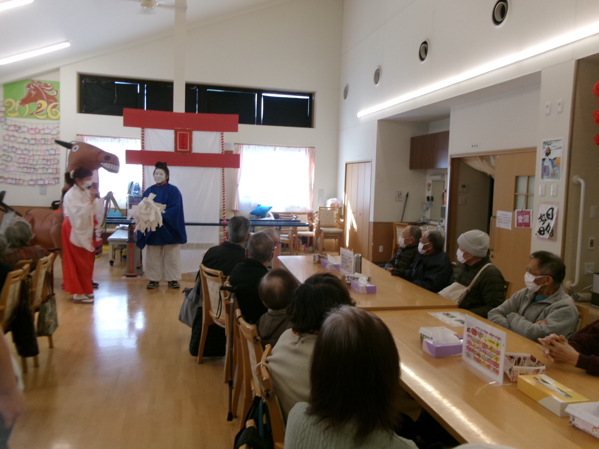 新年会スタート!神主と巫女に扮した職員による神儀の寸劇。利用者様は演技に引き込まれていました。