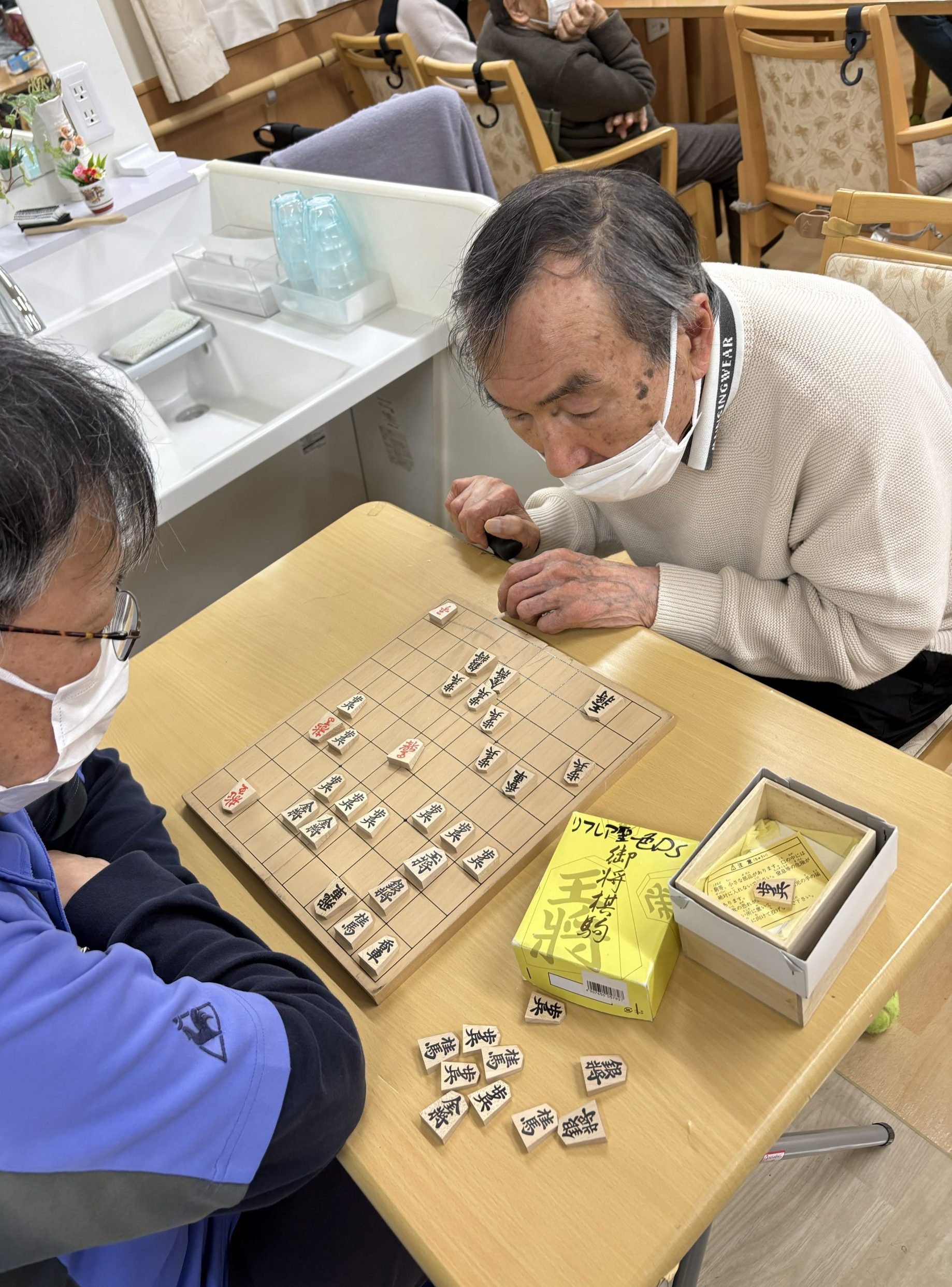 2026.02.14 ⭐日常⭐ 職員と将棋の勝負🔥🔥 私には見ていてもさっぱりわかりません😂😂(笑) おーーい✋✋とマージャンの方で呼ばれたのので行ってみると・・・ 「大三元で上がったんだよ―――」と笑顔で教えてくれました~(#^^#) 一覧へ戻る