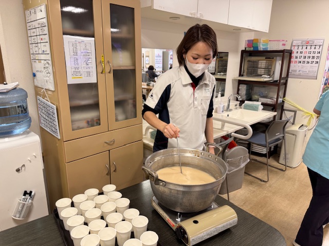酒蔵より酒粕をいただいたので甘酒を作り、みなさんで美味しくいただきました。