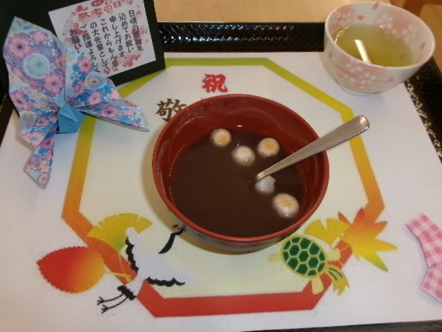 おやつはお祝い鶴をつけたメッセージカードも添えてぜんざいと抹茶入り玄米茶を召し上がっていただきました。