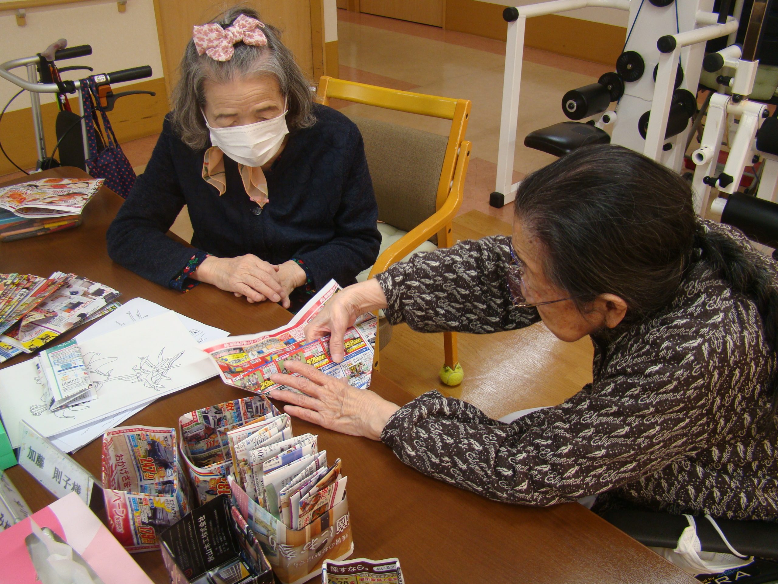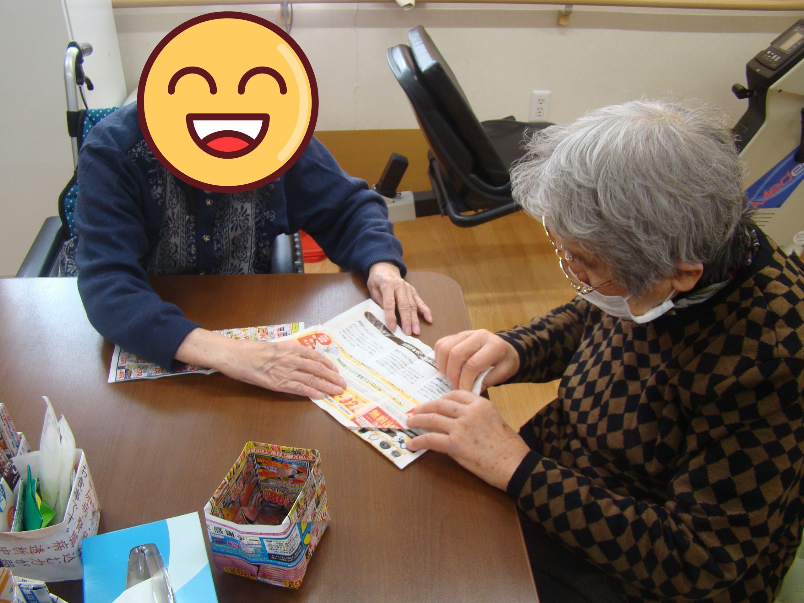 2026.04.24 👵🏻ショートステイの日常👴🏻 午後のひと時☀️ フロアのテーブルに置くゴミ箱を作ってくださっています。 得意な方が他の方に教えてみんなで作ってくれています😊 いつもありがとうございます✨ 一覧へ戻る