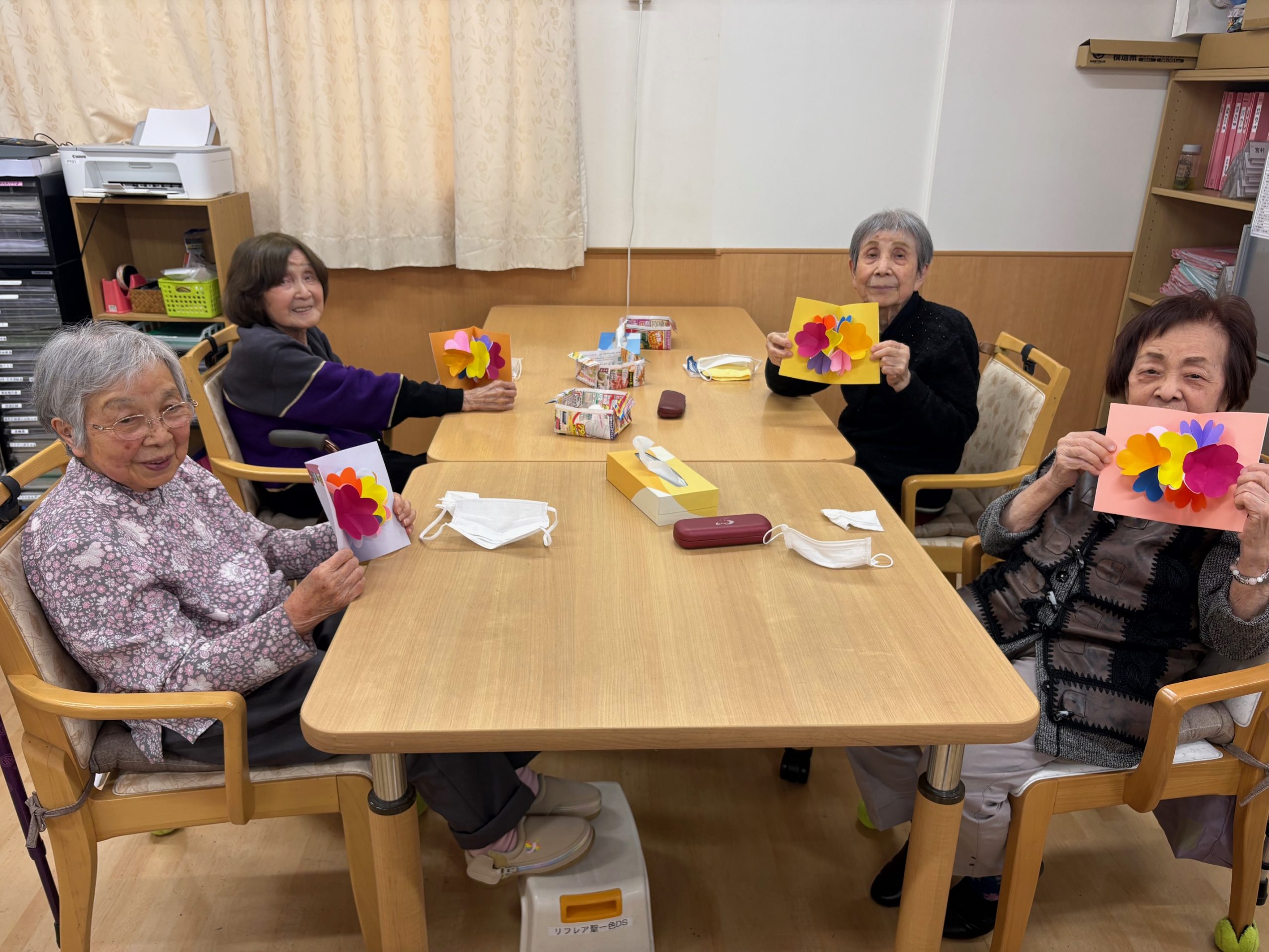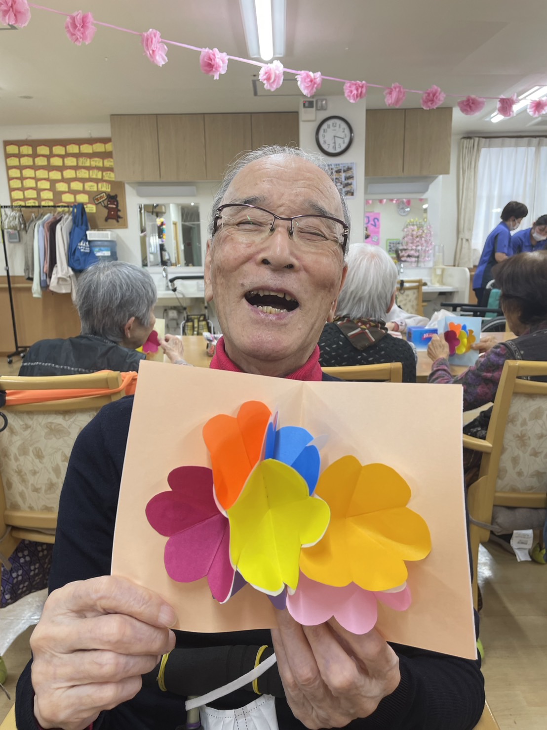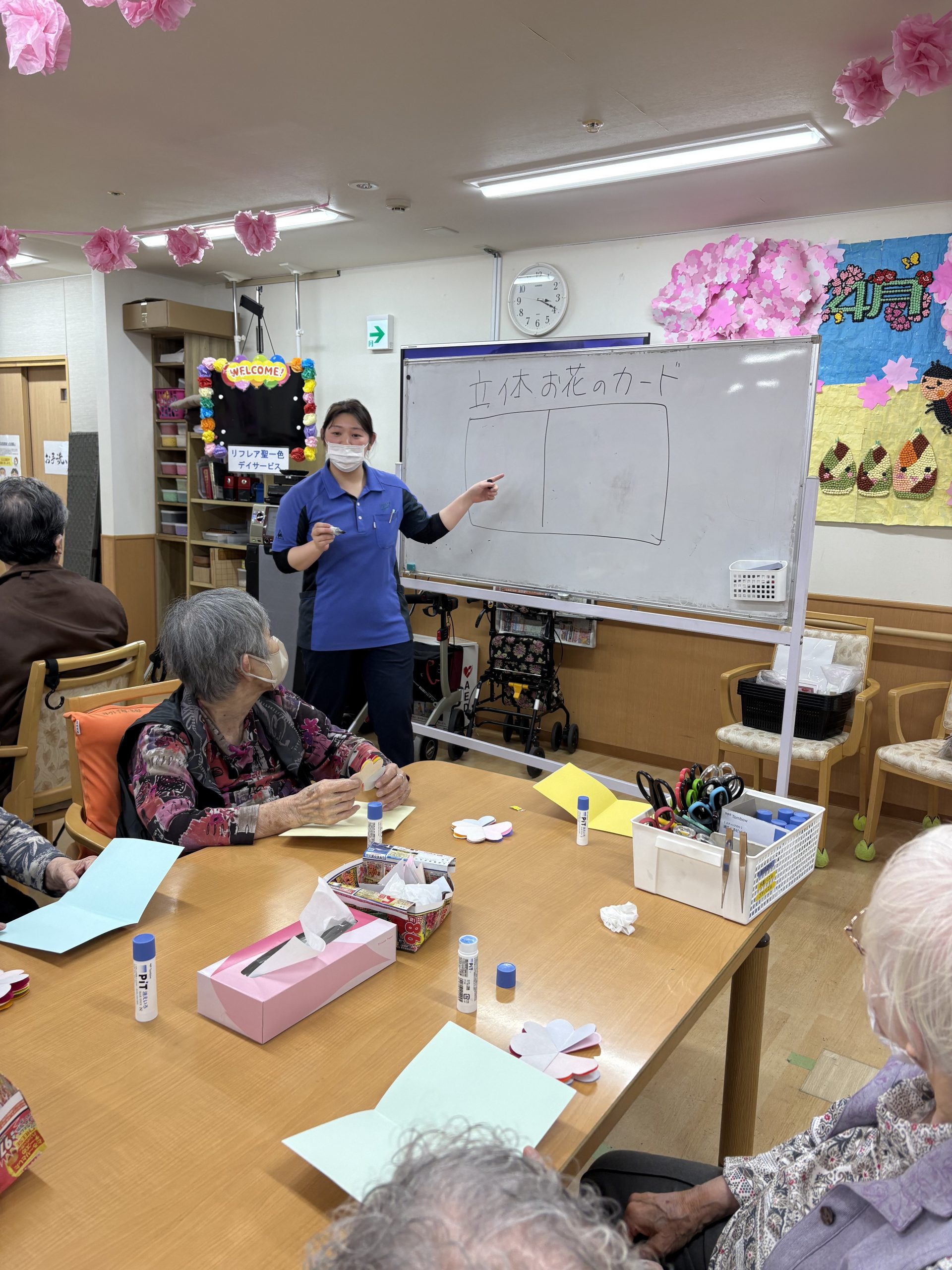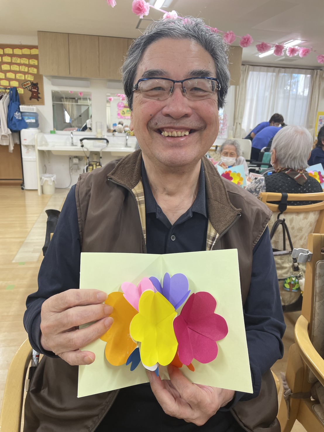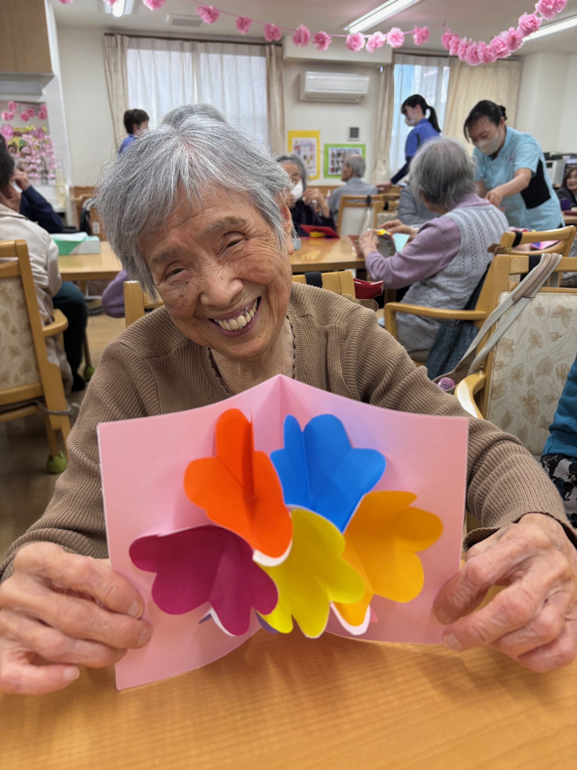 2026.04.23 💌立体カード作り💌 今月の工作レクは 【立体カード作り】 職員からよーーく話を聞いて間違えないように!!と忠告🤫🤫 職員が大きな声で作業内容やら順番やらを必死に伝えてました!(笑) 出来上がりました!みなさんお見事👏👏👏 一覧へ戻る
