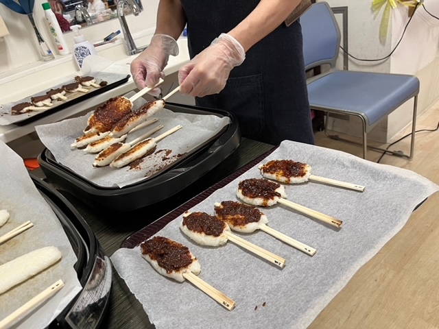 みなさんが形作ってくれた五平餅にたっぷりのクルミ入り味噌だれを塗って、