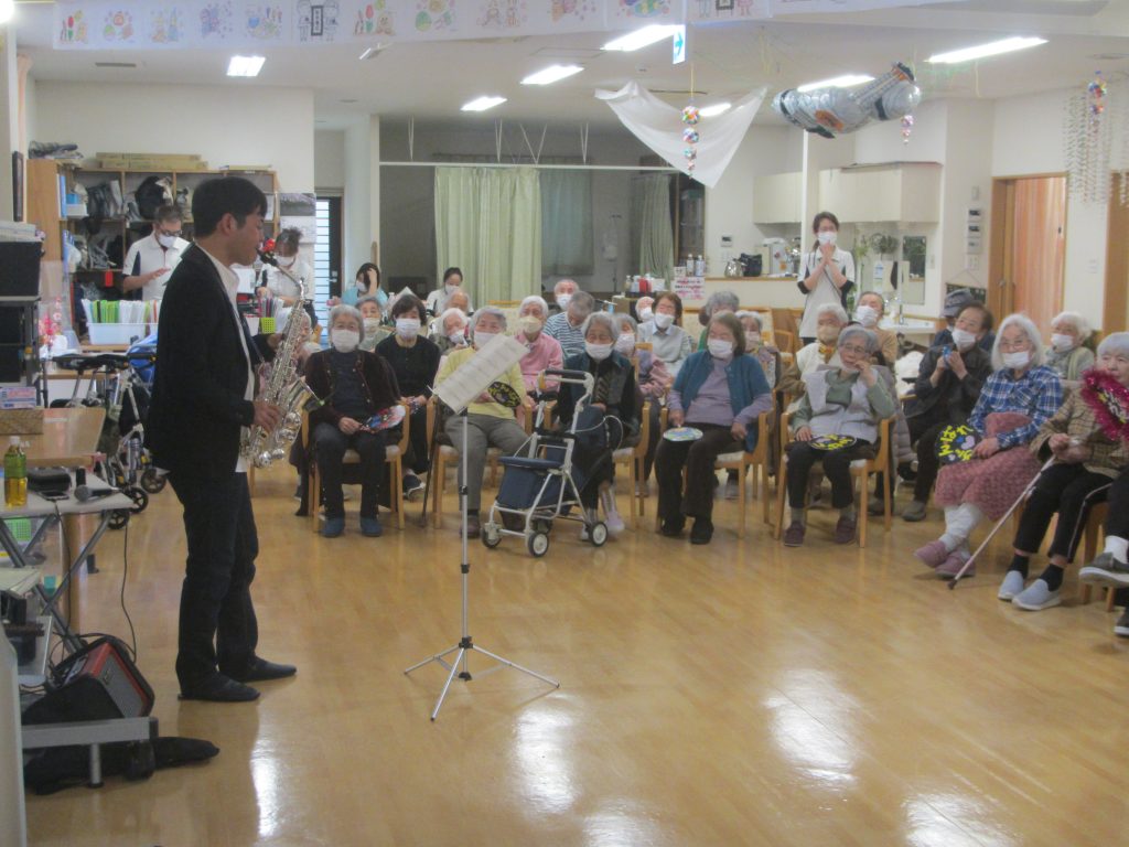 演奏が始まると、サックスの美しい音色が施設中に響き渡り利用者のみなさんの表情が一気に明るくなりました。