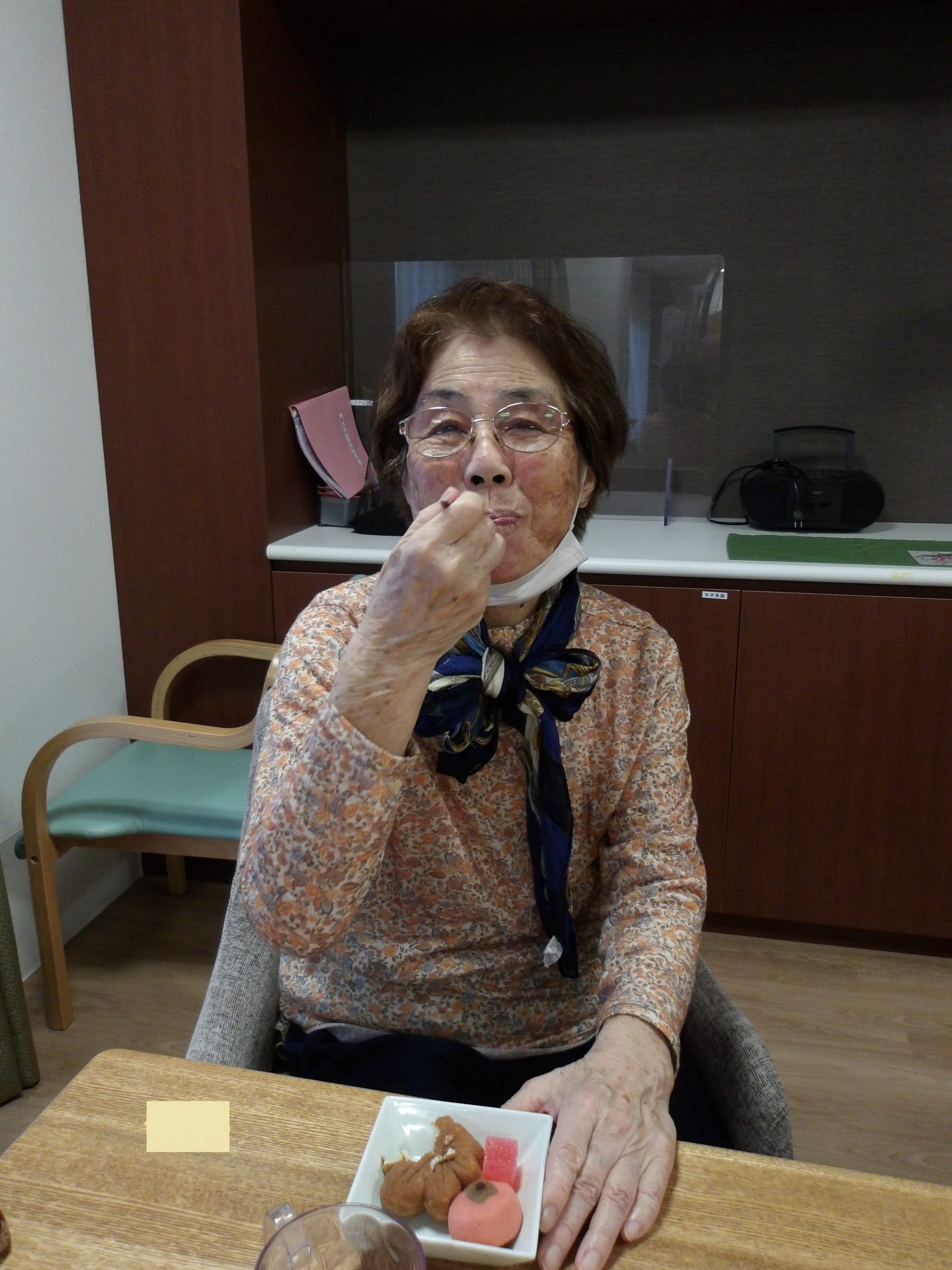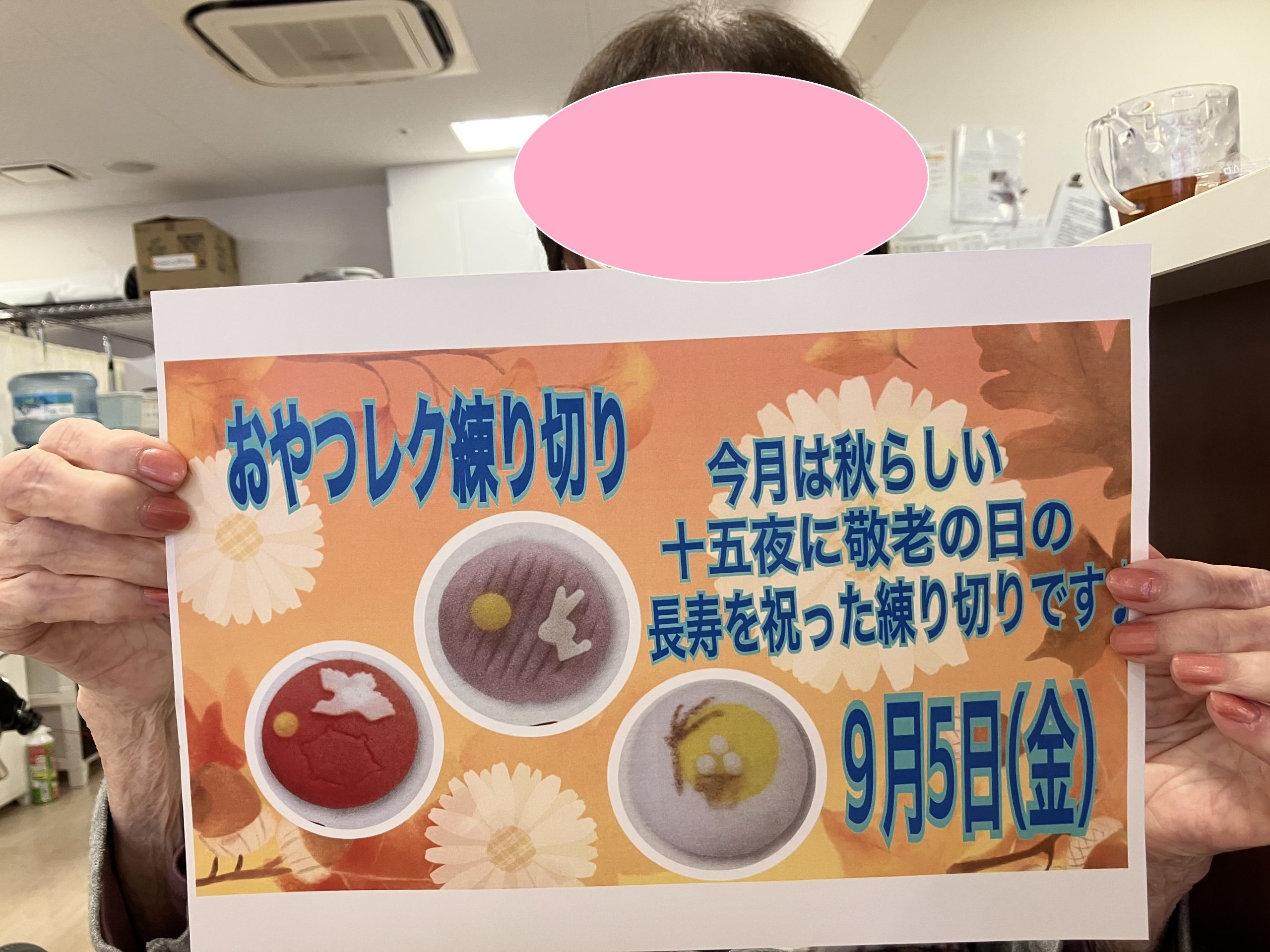 練り切りのデザインは、季節感を大切にしたものとなっており、見た目にも楽しんでいただける工夫をしています。今回は、9月・10月に実施したおやつレクの様子を、写真とともにお届けします。